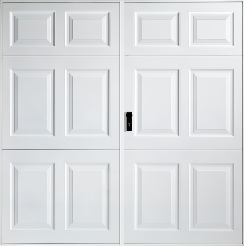 A very traditional looking style of door that is manufactured in timber, GRP or steel. Side hinge doors open outwards and as such need good clearance outside the door when being opened. If you have a short driveway or onto a public pavement or footpath they may not be ideal. A good choice if there is no clearance inside your garage to allow for an up and over door.
